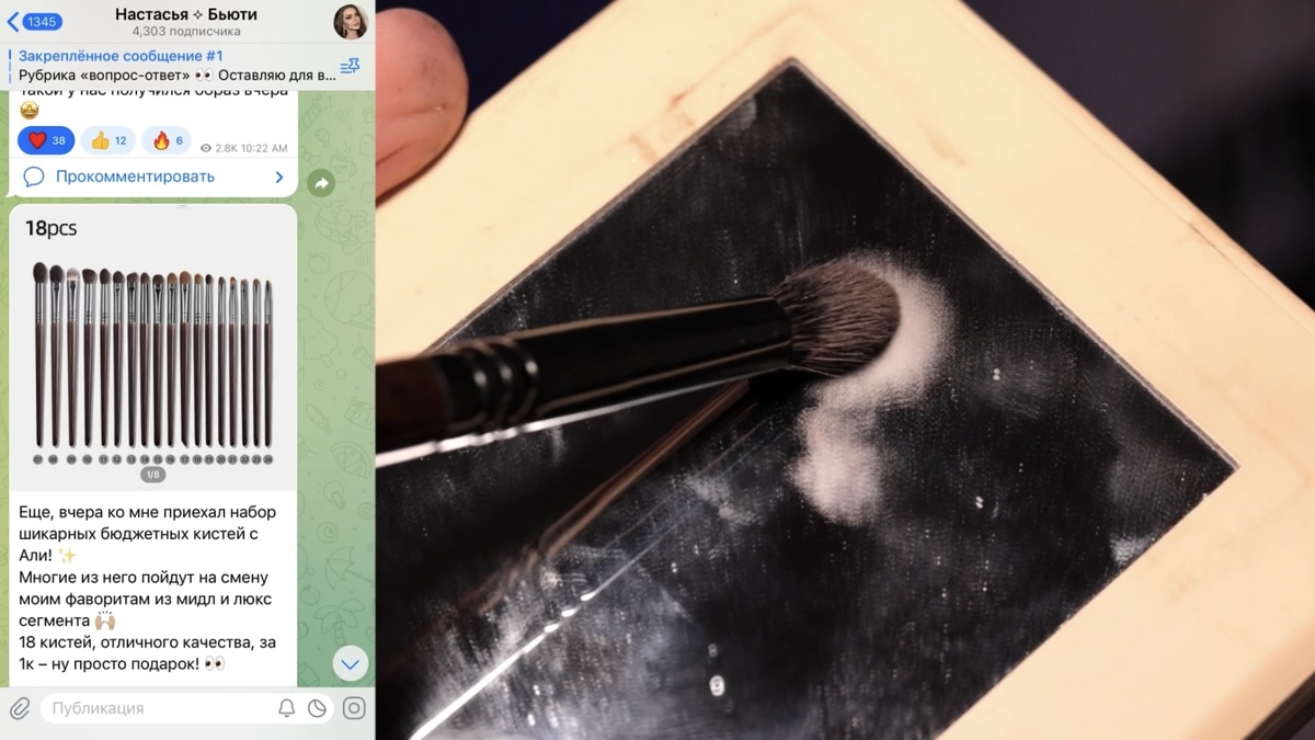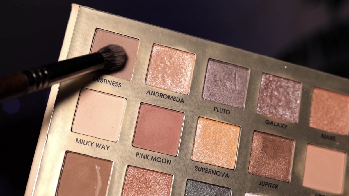Начинаю с нейтрального матового оттенка Mistiness. Набираю его на кисть в форме «свечки» (такие часто можно найти в бюджетных наборах) и обязательно стряхиваю излишки, потерев кисть о край палетки или тыльную сторону ладони. Это ключевой момент для равномерного нанесения без пятен.