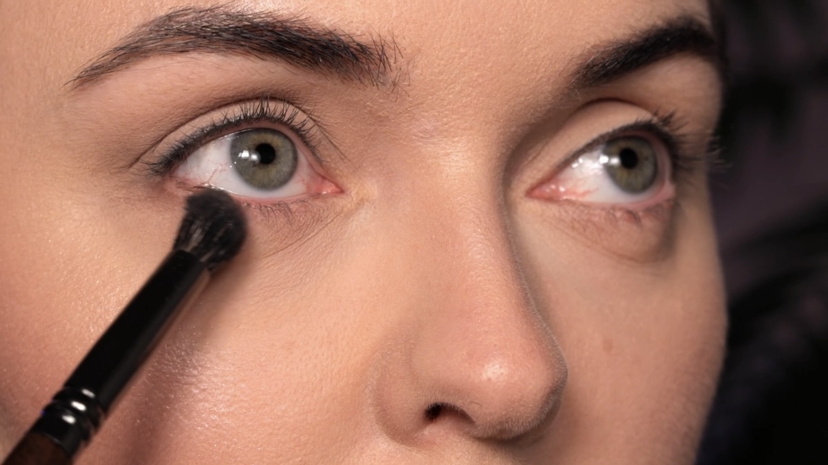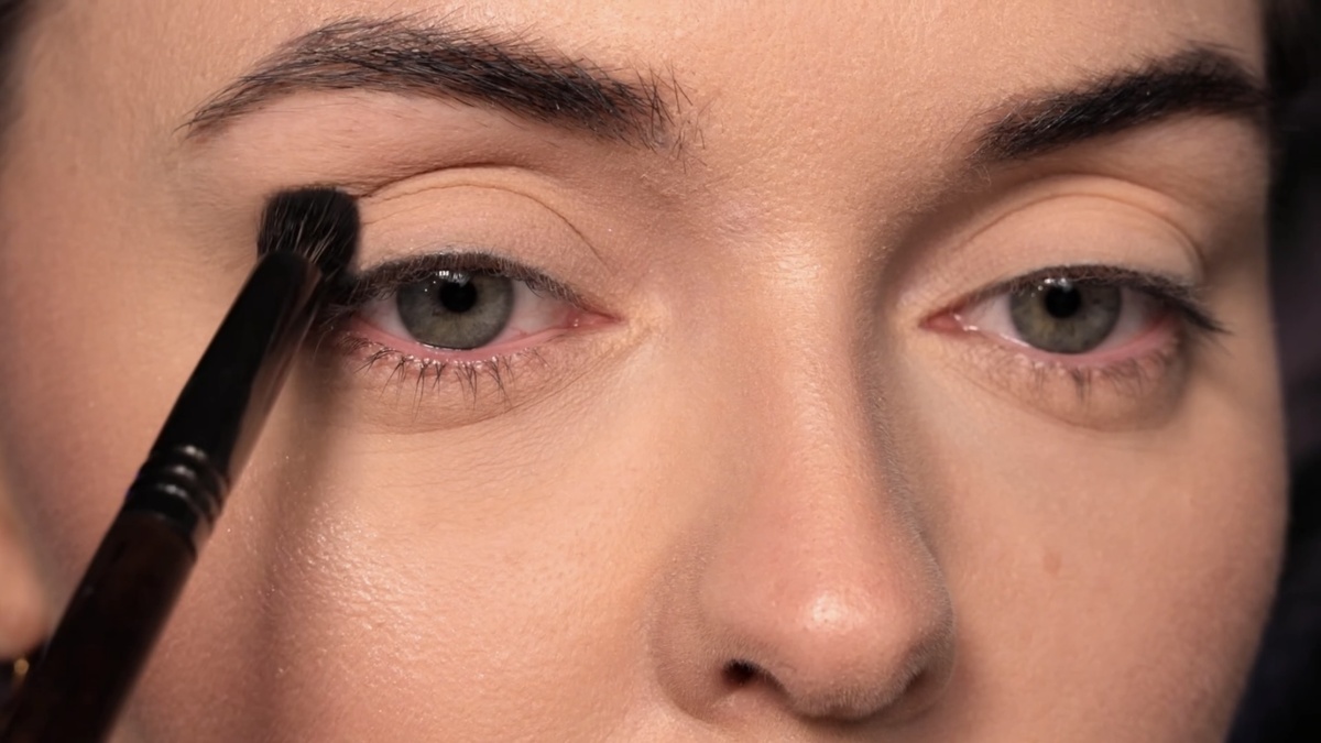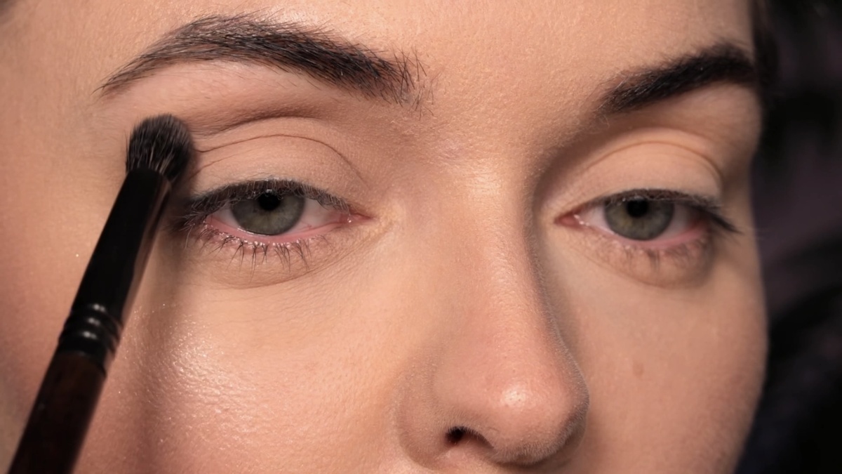 Располагаю кисть во внешнем уголке глаза, точно в складку века, и вращательными движениями распределяю цвет по всей складке, слегка захватывая пространство над и под ней. Форма кисти «свечка» идеально повторяет анатомию глазной впадины, что упрощает работу.