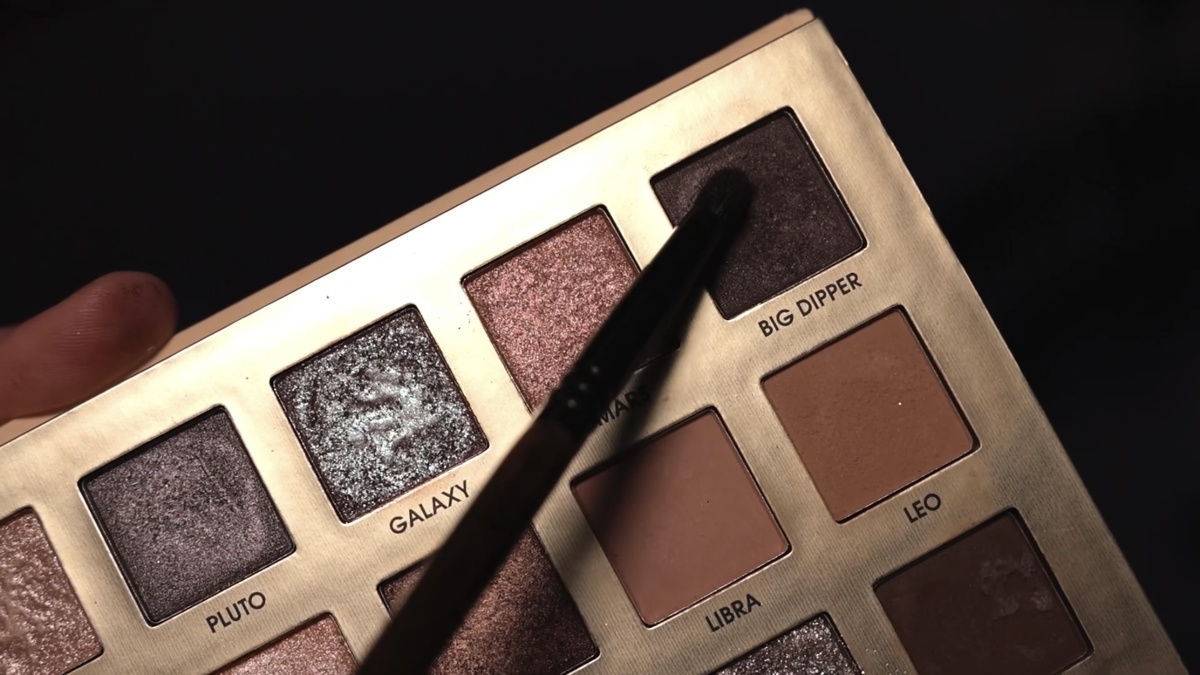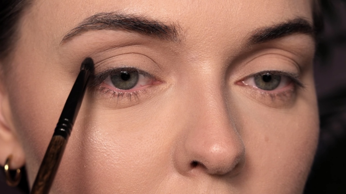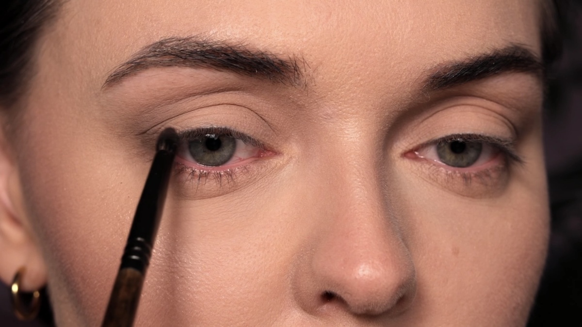Для углубления внешнего уголка беру более насыщенный оттенок Big Dipper — это коричнево-лиловый сатин. Наношу его меньшей кистью того же типа, концентрируя цвет на внешней трети века и в складке. Этот прием также отлично работает как anti-age лайфхак: с помощью темных матовых теней или сухого контуринга можно визуально скорректировать возрастное нависание века или «грыжи» во внутреннем уголке, сделав их менее заметными.