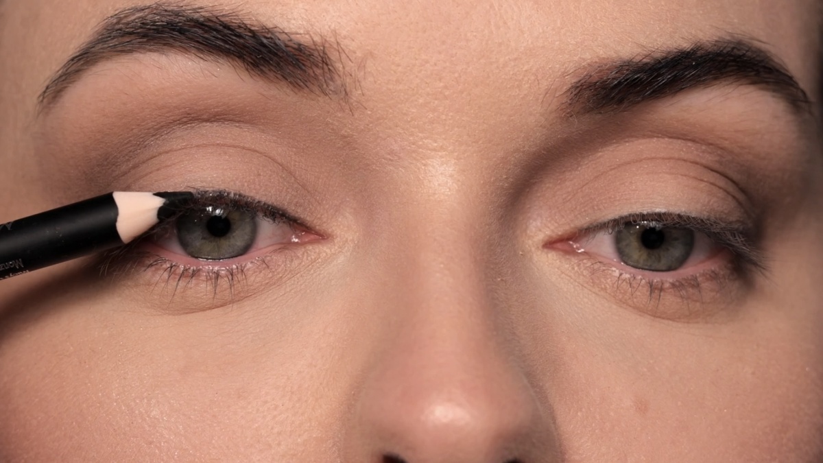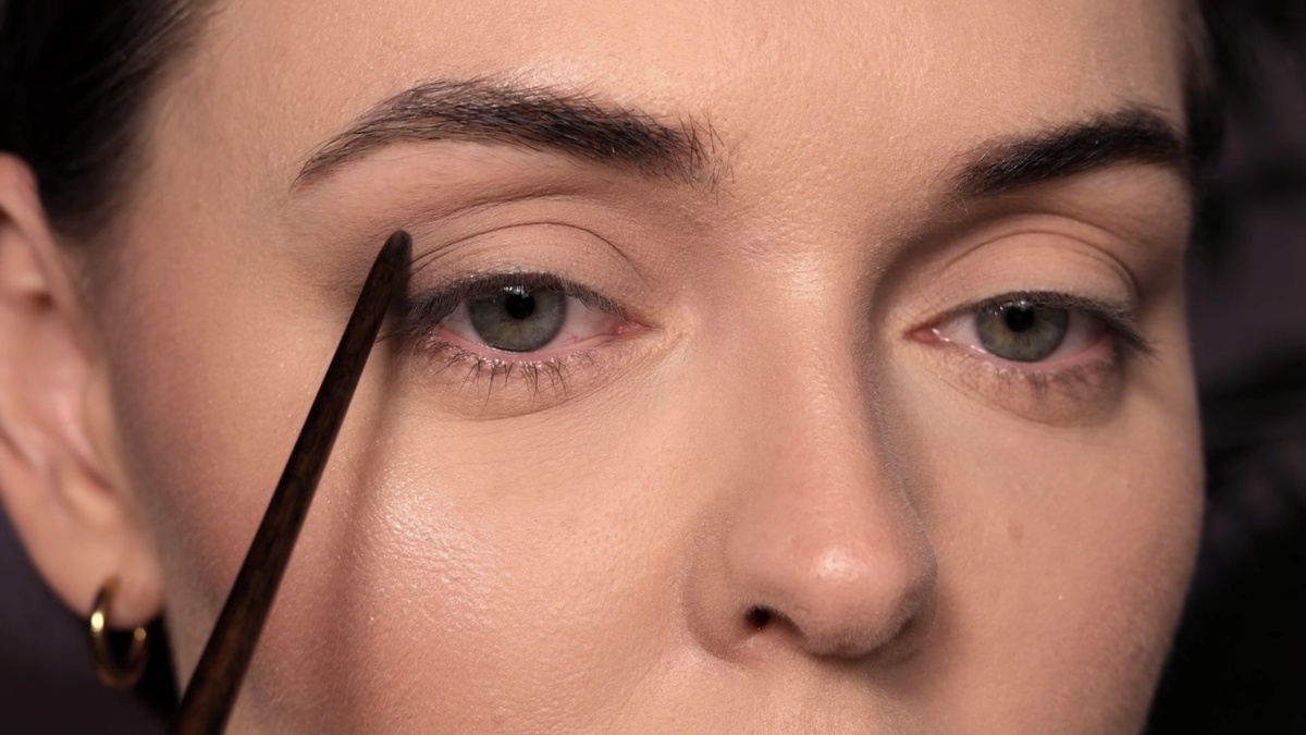 Техника нанесения важна, особенно при нависающем веке. Сначала я смотрю прямо в зеркало и короткими штрихами намечаю направляющую линию от внешнего уголка глаза по направлению к виску. Затем заполняю пространство у линии роста ресниц, соединяю его с направляющей, формируя треугольник, и аккуратно его закрашиваю. Получается четкая, но не резкая карандашная стрелка.