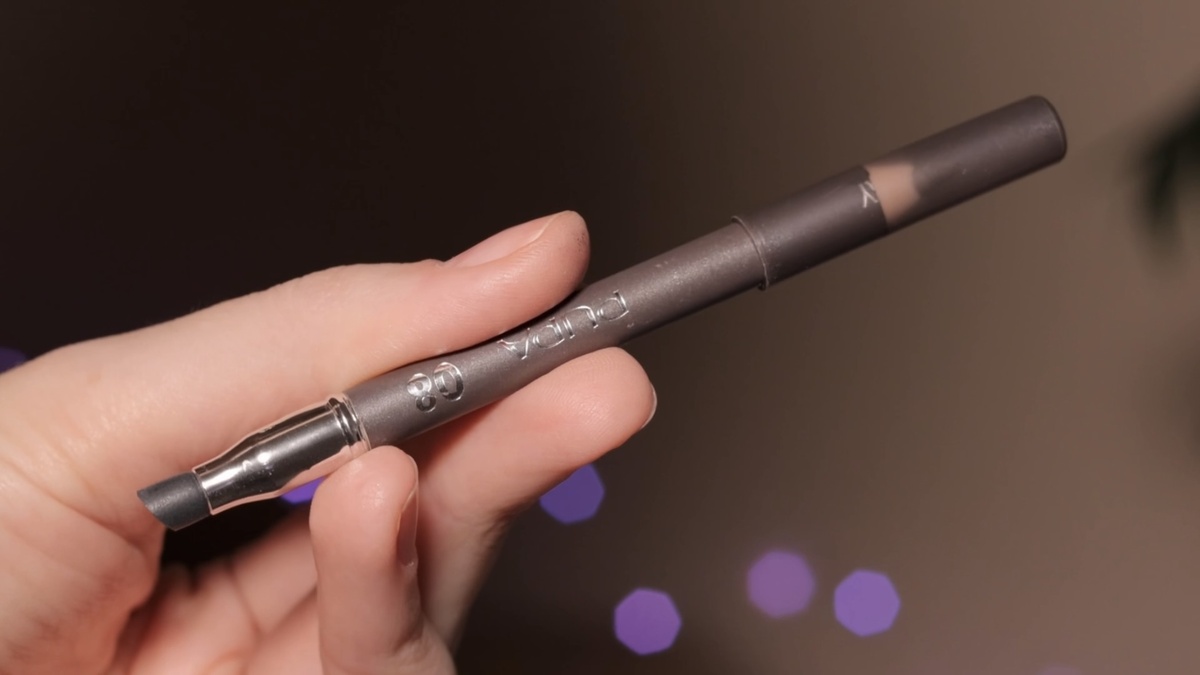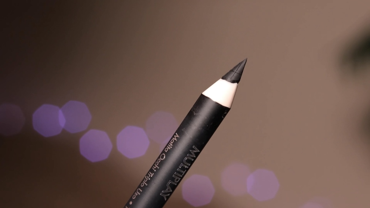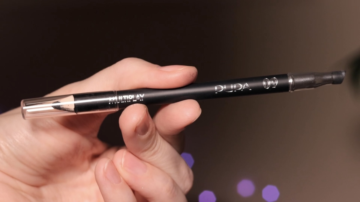 Перехожу к самому эффектному элементу — стрелке с блестками. Для начала мне нужен четкий контур. Я использую хорошо заточенный черный карандаш от Pupa (оттенок 09).