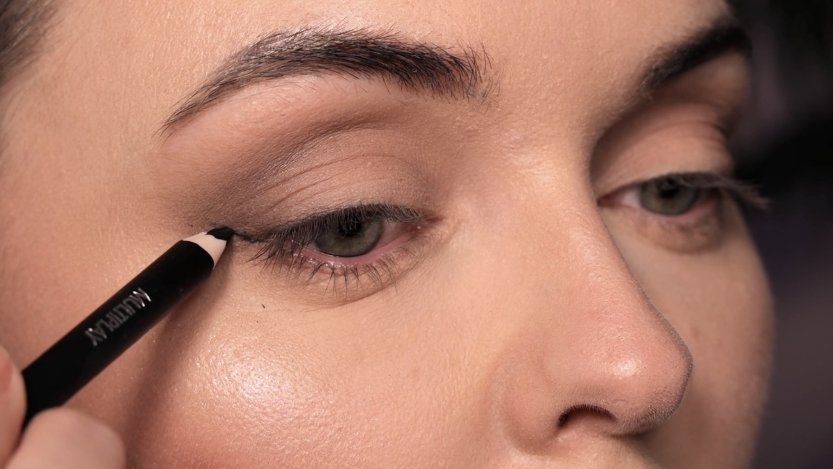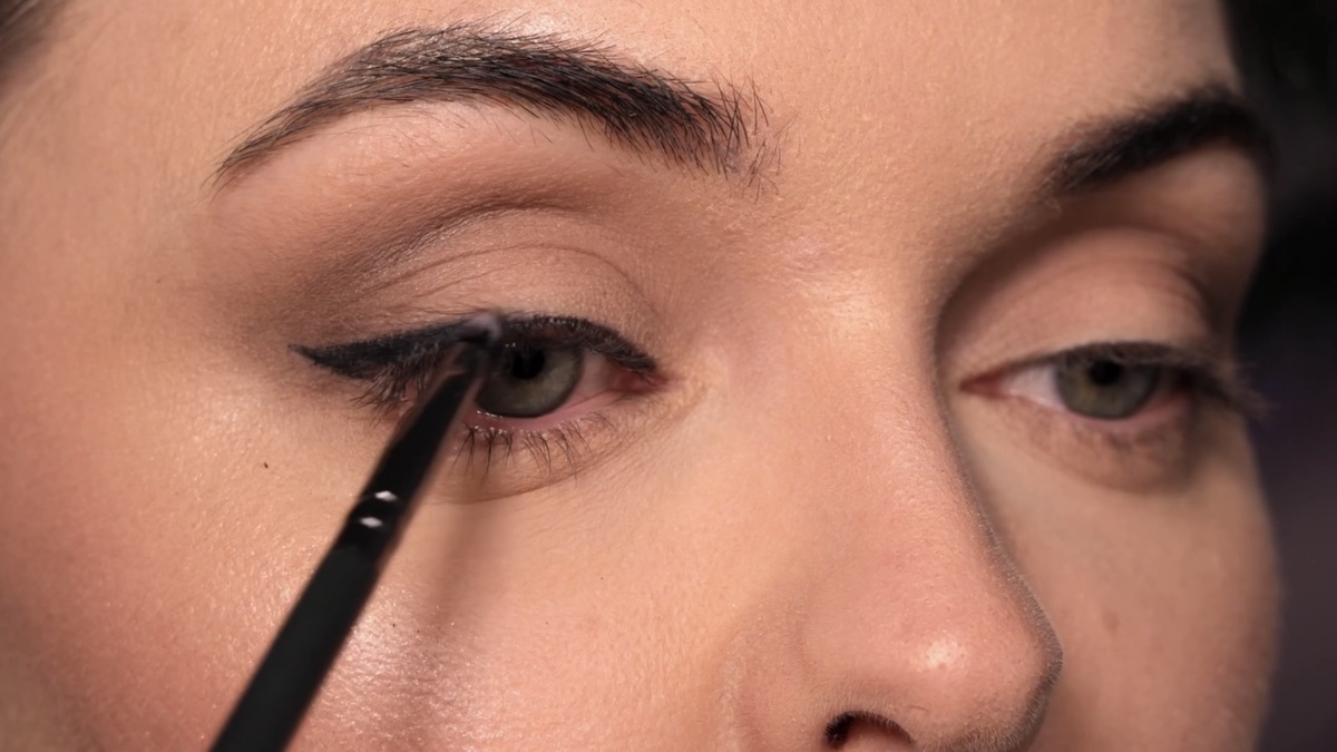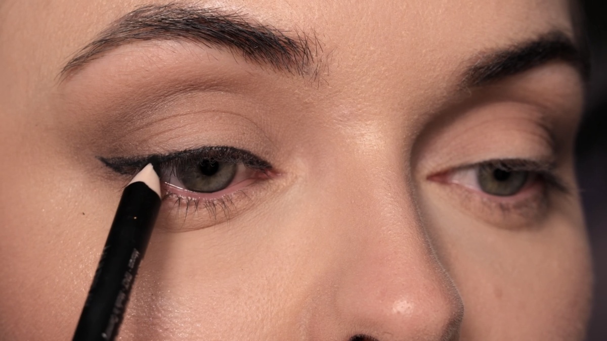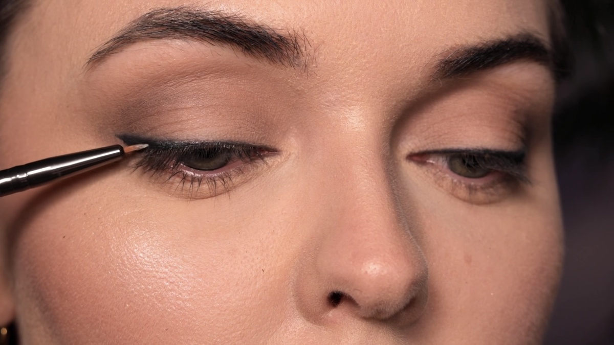 Чтобы смягчить границы и придать стрелке дымчатый эффект, я растушевываю ее верхний край чистой синтетической кистью (например, Deka 312) легкими движениями «туда-сюда». Также подводю карандашом слизистую и межресничное пространство.