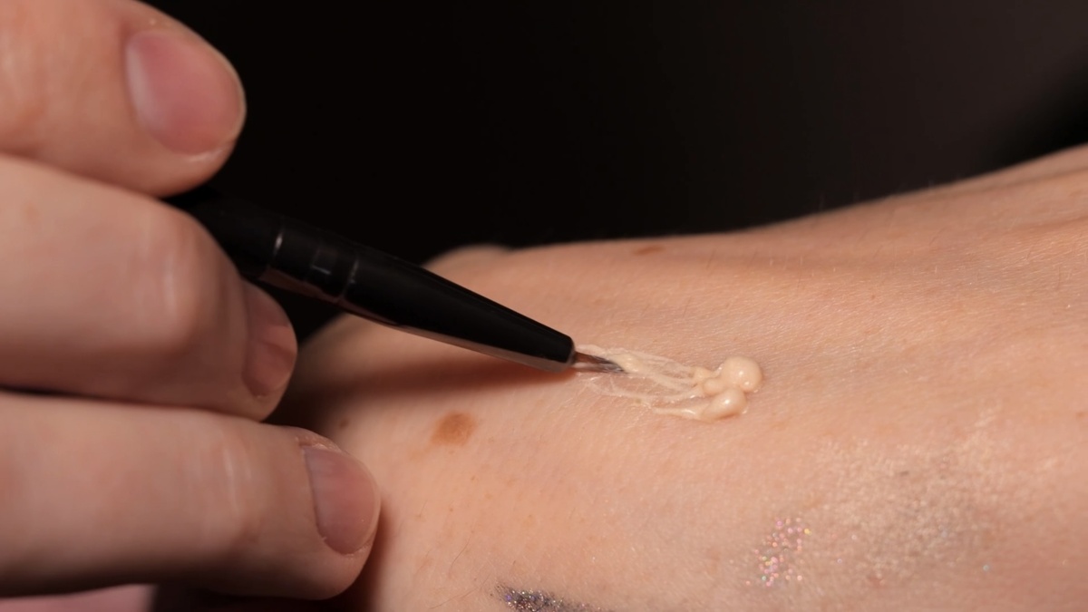 Наношу на стрелку специальный праймер для глиттера тонким, равномерным слоем с помощью кисти для подводки (TNL T301). Даю ему подсохнуть 30-40 секунд, чтобы клейкая основа активировалась.