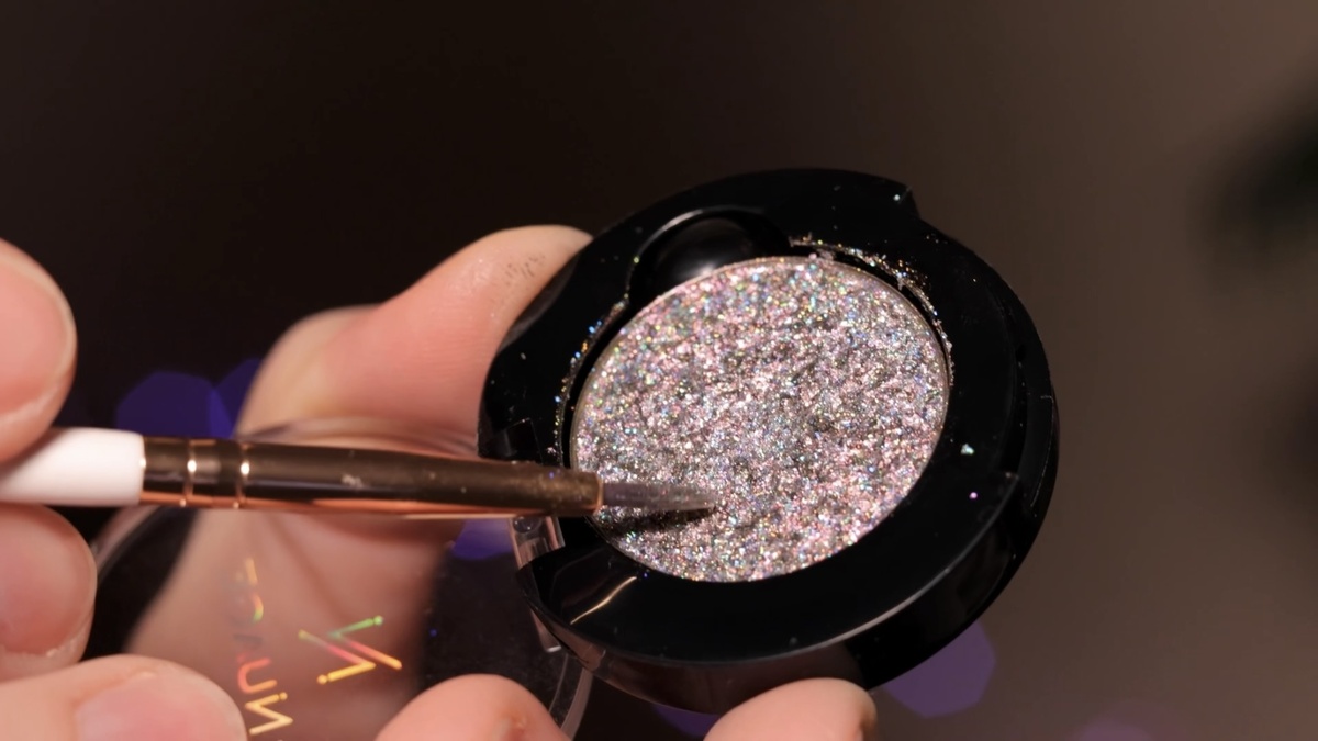 Для финального акцента беру роскошный многогранный спаркл G2 от Be-nuage с голубой базой и розово-голографическим отливом. Аккуратными припечатывающими движениями кисти Top Face 16 (подойдет любая плотная кисть для подводки) наношу блестки поверх праймера, точно повторяя форму нашей стрелки, от внутреннего уголка к внешнему.