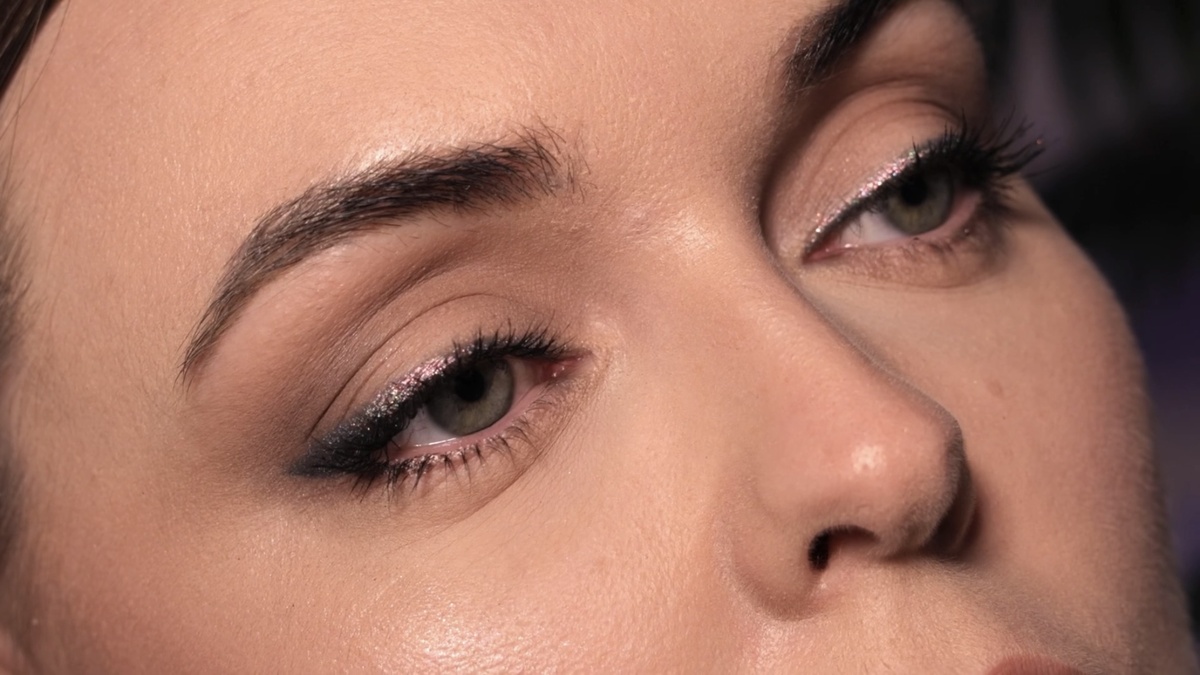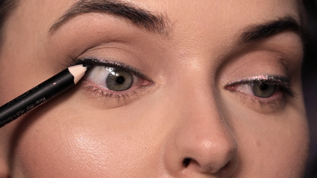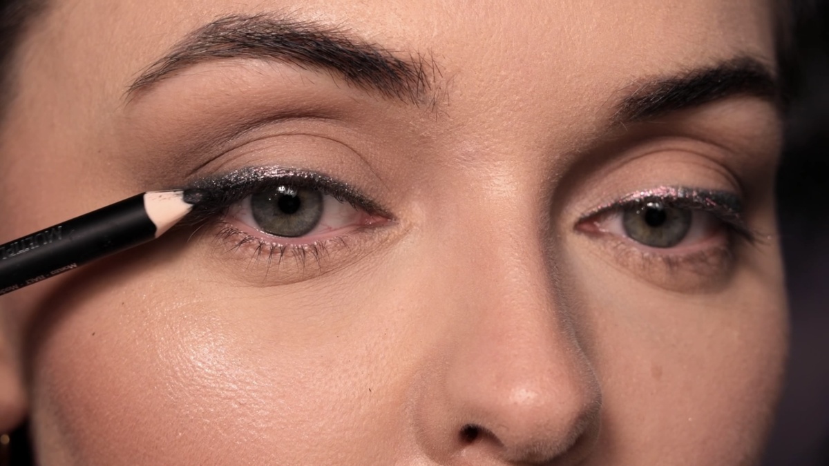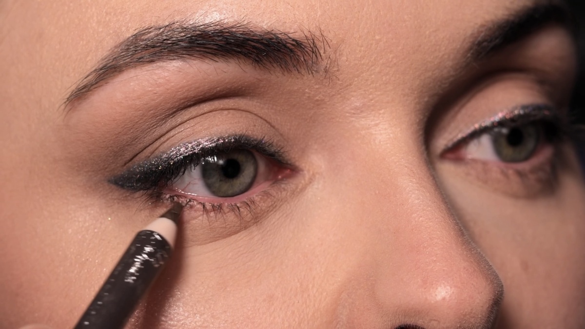 Чтобы стрелка не «потерялась» под слоем блесток, я слегка затемняю ее внешнюю часть, проходясь по глиттеру тем же черным карандашом. Это добавляет глубины. Для нижнего века использую карандаш от Pupa в оттенке 08, прокрашивая только внешний уголок и растушевывая его.